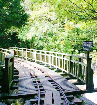 トロッコ軌道と並行して続く安房川を渡るポイント。春~初夏は山桜や新緑が美しい。欄干があり比較的安心して渡れるが、橋のすき間からは眼下を流れる安房川の巨岩が転がる河原も望め、高度感が楽しめる。