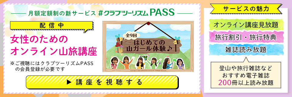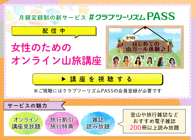 クラブツーリズムから初めての山ガール♪女性のための山旅のご案内。登山ガイド同行だから安心で快適。ハイキングや山登りを始めたい!そんな女子のために気軽に参加できるツアーをご用意しました。ツアーの検索・ご予約も簡単。