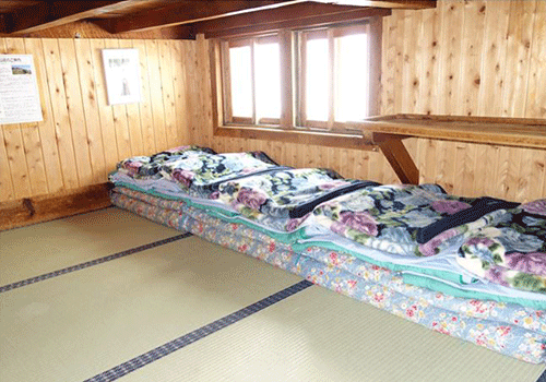 まずは自分が寝る場所を確認しましょう。客室の様子は畳に雑魚寝するスタイル、蚕棚(ドミトリー)や2段ベッド形式など、小屋によって様々です。また寝具も、布団と毛布(混雑時はひとり1枚利用できない場合も)、シュラフ(寝袋)など様々です。基本的に相部屋利用なので、他の方々の迷惑にならないよう、音や光(ヘッドライトなど)にはご注意ください。