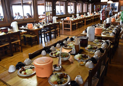 おまちかねのお食事。時間はその日の宿泊人数などで当日の決定となりますので、添乗員からご案内します。食事のメニューは基本的にメインの肉・魚のおかずやサラダ・煮物・漬物などが予めテーブルに並べられており、着席したテーブルから温かいごはんとみそ汁が配膳されます。ただし、これはあくまでも一例。おかずは好きなものを好きなだけ自分でとるビュッフェスタイルの山小屋や、趣向を凝らした名物メニューのある山小屋も多いので、おなかいっぱい楽しんでください。