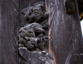 井波彫刻初期の傑作とされる北村七左衛門の「獅子の子落とし」(勅使門)