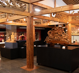 丸みを帯びたカーブもヤスリは使わず、彫刻刀だけで仕上げる井波彫刻。会館に展示されている、仏像、欄間、パネルなどさまざまな木彫刻作品を鑑賞するだけで、井波彫刻の技術の高さを理解するのに役立ちます。作品の制作依頼も可能です。