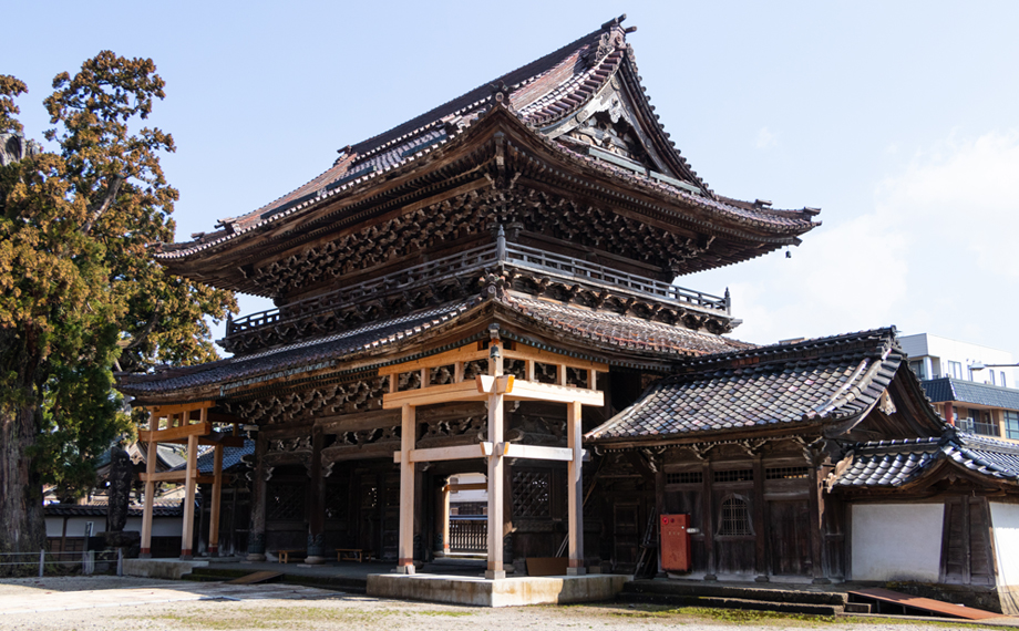 東本願寺の火災により帰京した京都の宮大工の後を引き継ぎ、江戸末期に井波の大工・松井角平恒徳が完成させた山門。「太子伝会」開催時には、山門に登ることができます。古い山門から望む井波の町は格別です