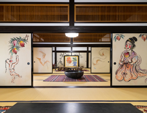 真宗大谷派の500年以上の歴史ある寺院。18代住職・高坂貴昭さんが民藝に造詣が深く、棟方志功と親交があったことから、寺には志功による襖絵「華厳松」が残されています。力強い松の絵は迫力があり必見。光徳寺のある福光は、棟方志功の疎開先でもあり、この地で作風の転機を迎えたともいわれています。また、日本画家・岩崎巴人の襖絵や世界各国の民芸品を数多く展示。木のぬくもりを感じる、アジア・アフリカ・ヨーロッパの各地の家具の陳列に、お寺である事を忘れるような感覚にとらわれます。