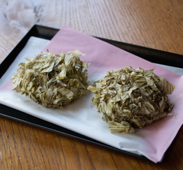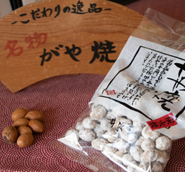 城端の曳山会館目の前「井波屋」の昆布餅は、おもちにおぼろ昆布が巻いてあり、絶妙な塩加減で美味。少し硬めな食感のカヤの実で作った「がや焼き」も城端地区の銘菓なので、ぜひお試しください。