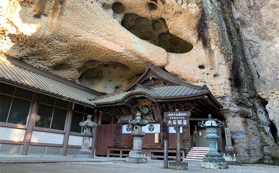 大谷寺(坂東三十三観音第19番札所)。本堂に覆いかぶさるような大谷石の奇岩は、長い年月をかけて自然の力がつくり上げたもの。本尊の大谷観音をはじめ、釈迦三尊・薬師三尊・阿弥陀三尊の計10躰が大谷石の壁面に彫刻され、すべて国の特別史跡・重要文化財に指定されています