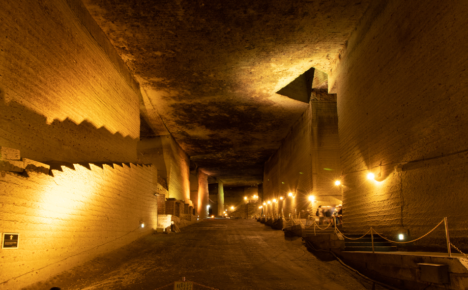 一歩足を踏み入れると、まるで神殿や古代遺跡を思わせる神秘的な地底の景観に圧倒されます。広さ2万u、深さ30mに及ぶスケールは、1919年から約70年の歳月をかけて造られたものです。