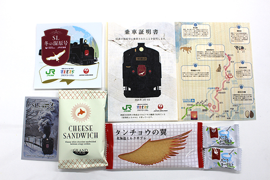 今回のツアーの限定企画「SL冬の湿原号」クラブツーリズム特別貸切は、JR北海道・JAL・クラブツーリズムの3社のコラボのもと生まれたもの。乗車中は貸切企画限定のプレゼントが配布されました。プレゼント内容は、ツアーのためにデザインされた「乗車記念証」やステッカー、地域特産のお菓子の詰め合わせセット。心のこもった丁寧なおもてなしとここでしか手に入らないグッズの数々に、特別感のあるひとときが過ごせました。