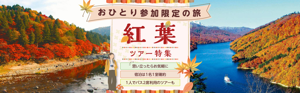 Club Tourism的秋季賞楓之旅僅限單人參加,並保證每人一間房間,並有導遊提供周到的支持。僅限一人參加,因此您可以隨時加入。我們對全國各地的紅葉觀賞景點都有計劃。搜尋和預訂旅遊非常簡單。