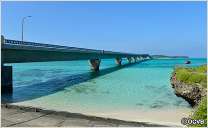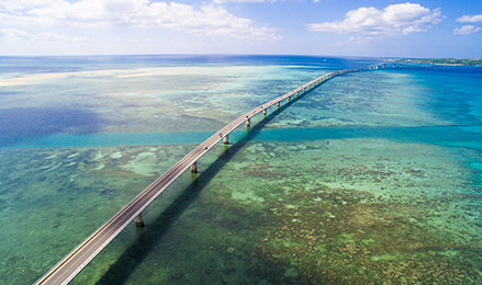 宮古島と来間島とを結ぶ全長1,690mの橋。晴れた日は特に宮古ブルーの美しいグラデーションを楽しめます。