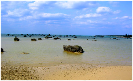 リーフに囲まれた遠浅の海は透明度抜群です。ビーチの沖合いには、津波で打ち上げられたといわれる大小の岩が顔を覗かせ、佐和田の浜の特徴的な風景をおりなしています。