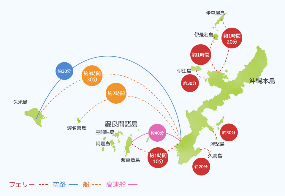 沖繩本島週邊地區大小不一,從慶良間諸島、久米島、大東島、渡喜島、久高島等未通過橋樑與沖繩本島相連的島嶼,乘高程僅需15 分鐘即可到達沖繩本島。